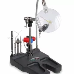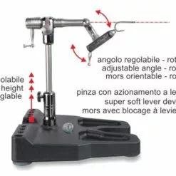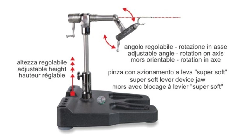 The stainless steel shaft rotates through two precision ball bearings. The shank of the hook rotates on axis thanks to the adjustable shaft. The steady pedestal base has a useful integrated tool rack and connection for magnifying glass item 642 (tools and magnifying glass not included). Other important features: interchangeable jaws, hook locking by “super soft” lever device, adjustable rotary tension, smooth rotary motion, locking position at any angle, adjustable height, reversible for left hand tying. Other accessories included: rounded shape bobbin cradle, parachute plier, adjustable spring material clip, pivot thread cradle, allen keys and instruction manual.